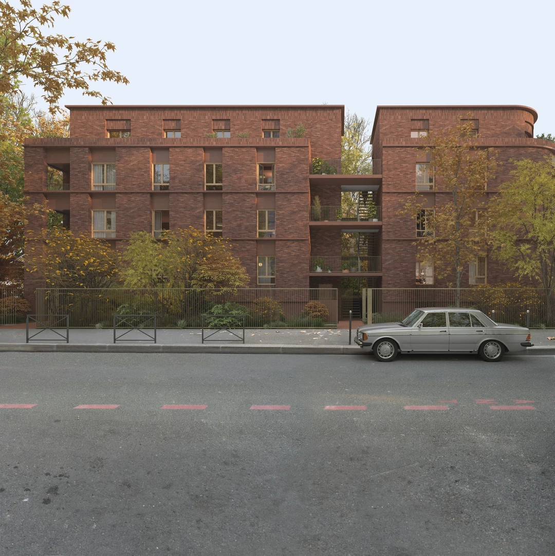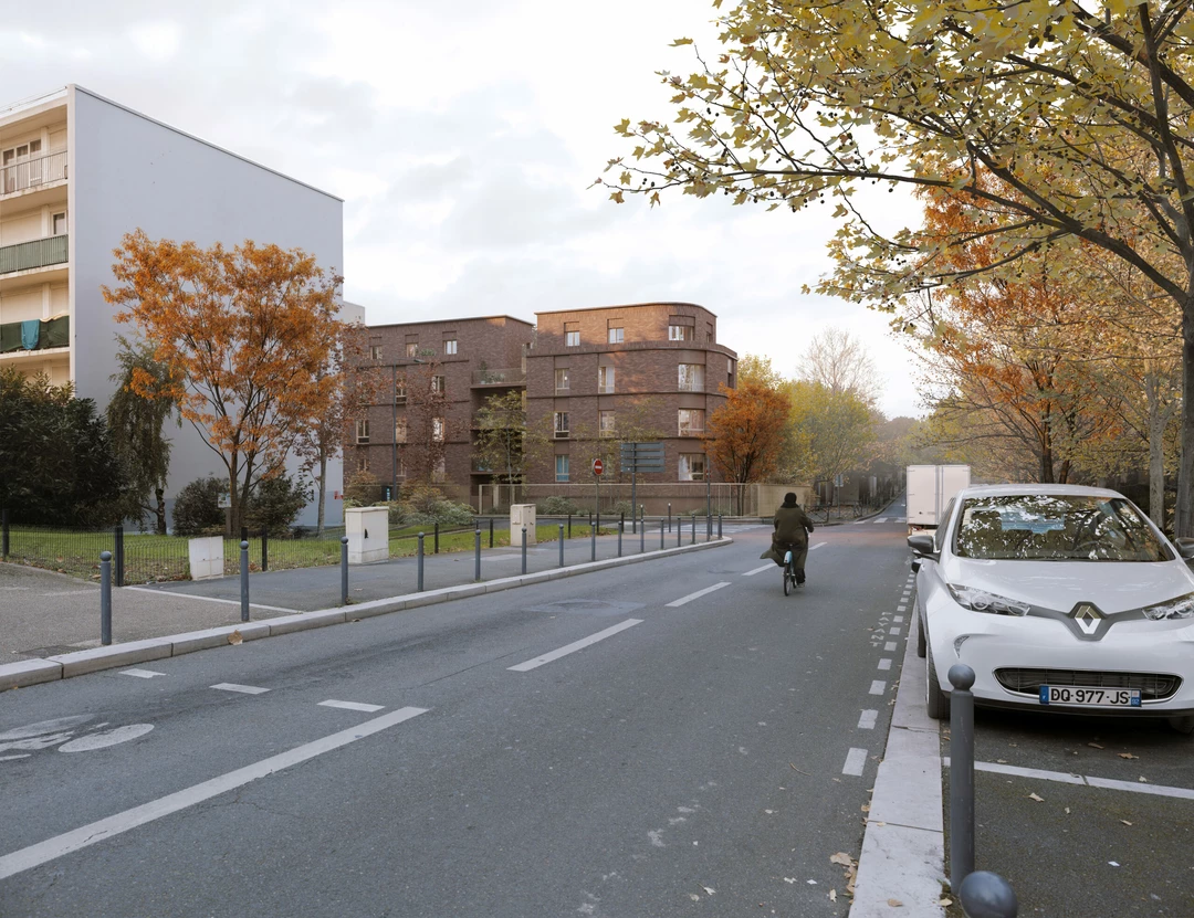 L’édifice s’articule autour d’un cœur d’ilot, une cour intérieure végétalisée est accessible par les habitants et crée une porosité visuelle avec l’espace public, la rue Henri Barbusse.