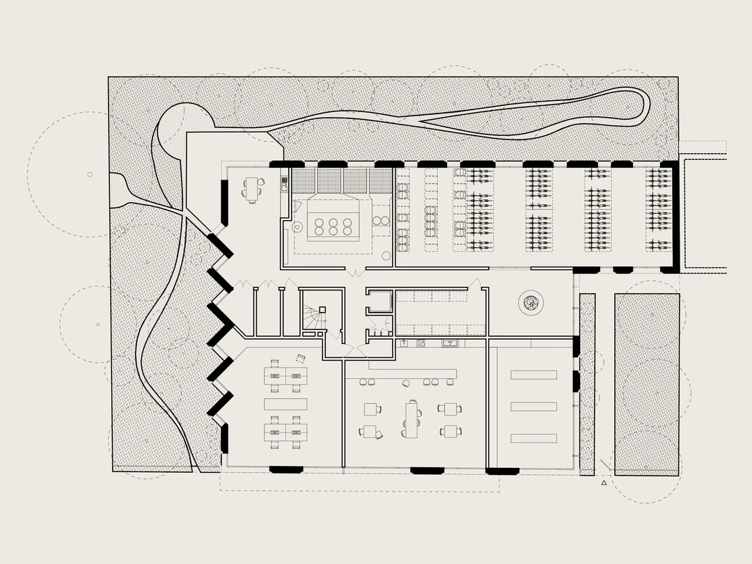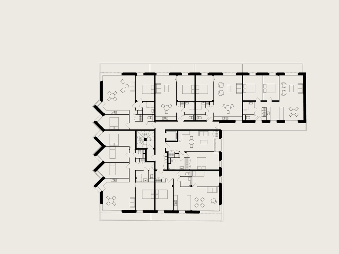 Conçu dans une logique de sobriété, le bâtiment adopte une forme compacte et une structure rationnelle autour d’un noyau central. L’usage de matériaux durables et réemployés — planchers bois-béton, pierre de façade issue de rebuts de carrière, béton de chanvre et béton partiellement recyclé — associé à la préfabrication et à l’assemblage à sec, permet de réduire l’impact environnemental, les nuisances et la durée du chantier.