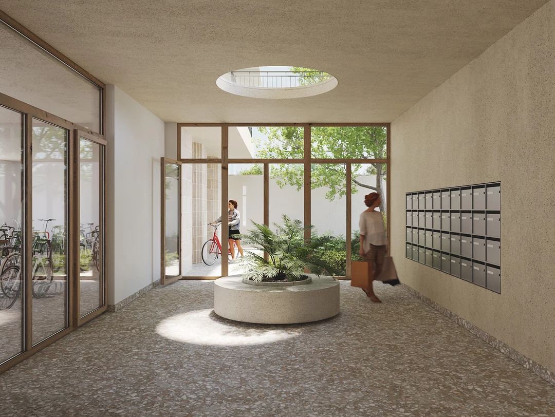 Le rez-de-chaussée participe activement à l’animation urbaine avec des commerces largement ouverts sur le boulevard. L’entrée des habitants est mise en valeur par la conservation d’un peuplier noir et un aménagement paysager généreux, donnant accès à un hall traversant, lumineux et naturellement ventilé, ainsi qu’aux locaux vélos. Les espaces communs et le jardin paysagé partagé favorisent la convivialité, les mobilités douces, la biodiversité et le rafraîchissement urbain.