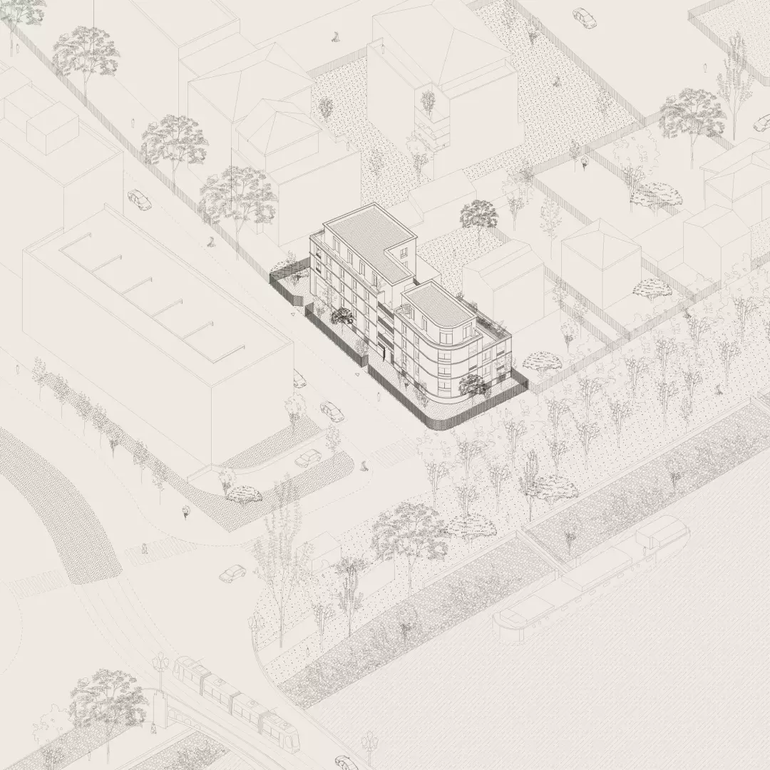 Le projet se compose de 12 logements répartis en deux volumes articulés par une faille dans laquelle viennent se dérouler les circulations verticales.