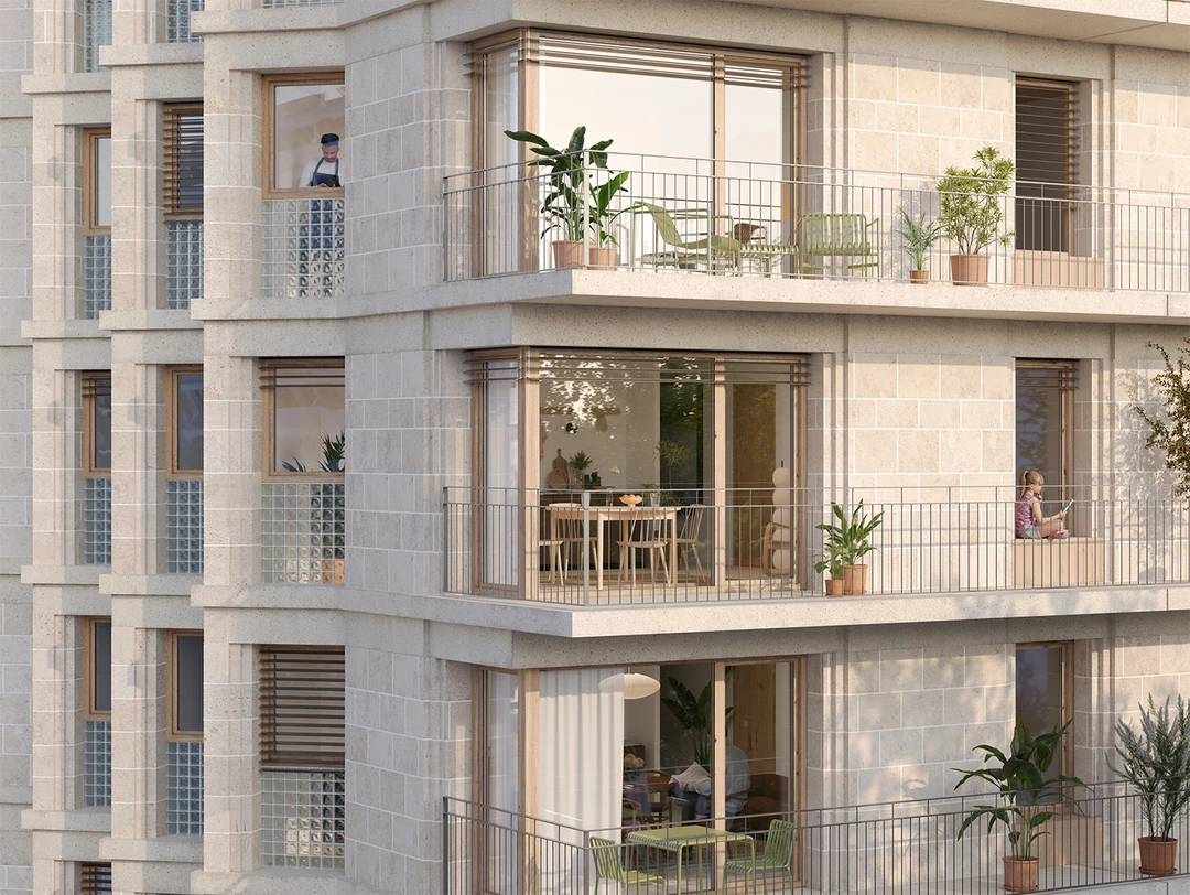 Le rez-de-chaussée participe activement à l’animation urbaine avec des commerces largement ouverts sur le boulevard. L’entrée des habitants est mise en valeur par la conservation d’un peuplier noir et un aménagement paysager généreux, donnant accès à un hall traversant, lumineux et naturellement ventilé, ainsi qu’aux locaux vélos. Les espaces communs et le jardin paysagé partagé favorisent la convivialité, les mobilités douces, la biodiversité et le rafraîchissement urbain.